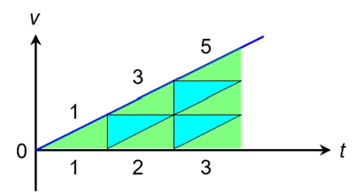 In addition, because the motion starts from v=0 at t=0, the (a) velocity, (b) distance travelled per unit time, and (c) total accumulative distance travelled, all form very nice number series.