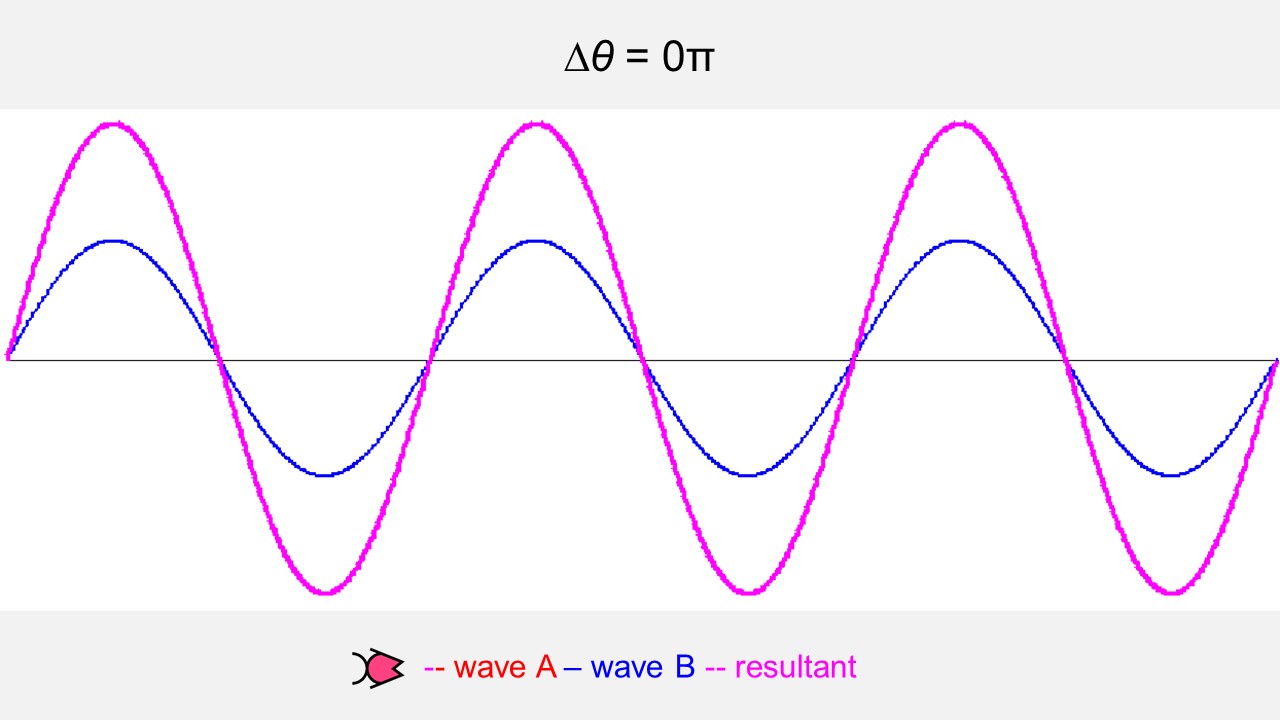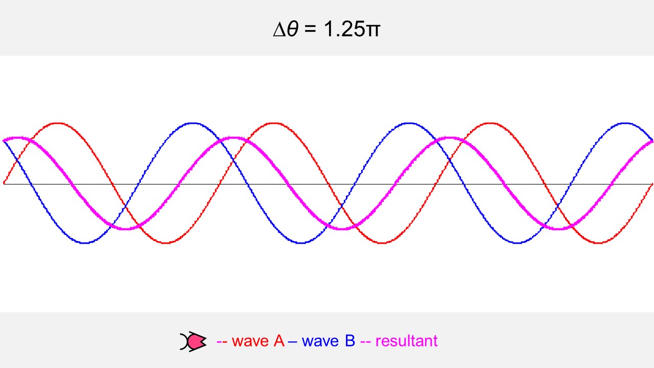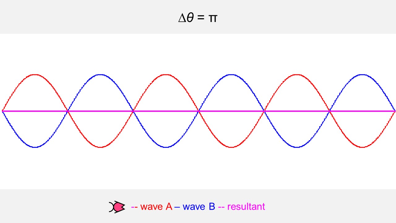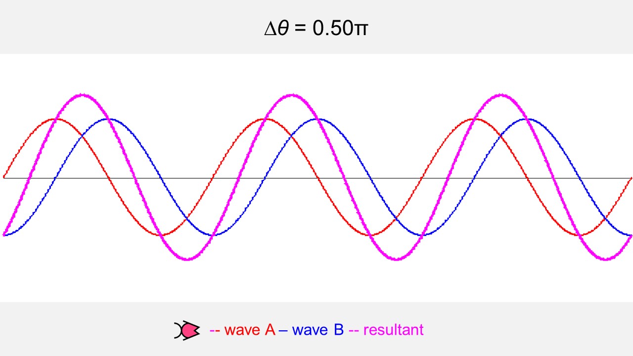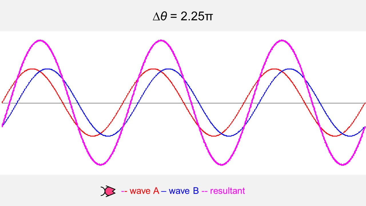 For your viewing pleasure, here is a stack of slides show the outcome of superposing two sinusoidal waves, at different phase differences ∆θ. Best viewed with this PDF under “fit-to-page” mode.