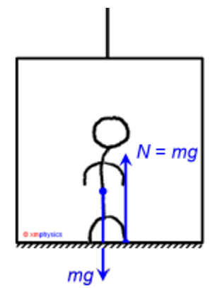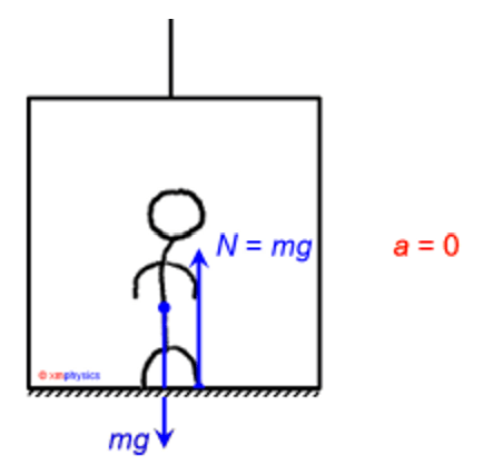 Speeding up from rest to 2.0 m s-1 in 4.0 s, the elevator is accelerating at . For the man to keep up with the elevator, he must be experiencing an upward net force. This means that N must be stronger than mg.
