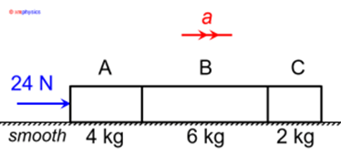 Block A, B and C of mass 4.0 kg, 6.0 kg and 2.0 kg respectively (pressing against each other) is pushed along a smooth horizontal surface by an external force of 24 N.