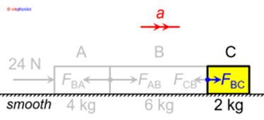 Notice that we have identified five forces in the picture: 24 N, FBA (force by B on A), FAB (force by A on B), FCB (force by C on B) and FCB (force by C on B). Note that FBA and FAB form an action-reaction pair. So do FCB and FCB.