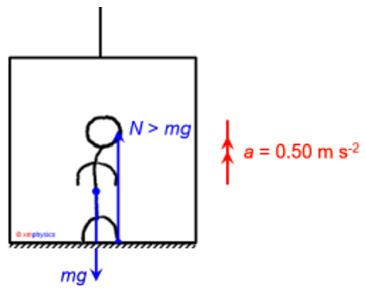 Speeding up from rest to 2.0 m s-1 in 4.0 s, the elevator is accelerating at . For the man to keep up with the elevator, he must be experiencing an upward net force. This means that N must be stronger than mg.