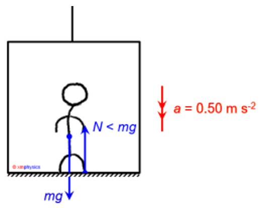 With N smaller than the usual 589 N, the man feels lighter than usual. In fact, if the man were standing on a weighing scale in the elevator, the scale will be reading 559 ÷ 9.81 = 57 kg (instead of the usual 60 kg).