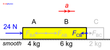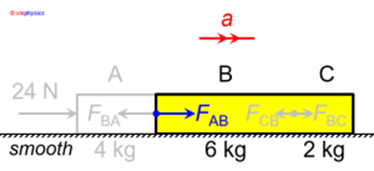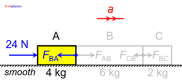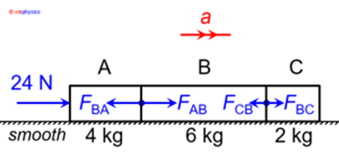 Block A, B and C of mass 4.0 kg, 6.0 kg and 2.0 kg respectively (pressing against each other) is pushed along a smooth horizontal surface by an external force of 24 N.
