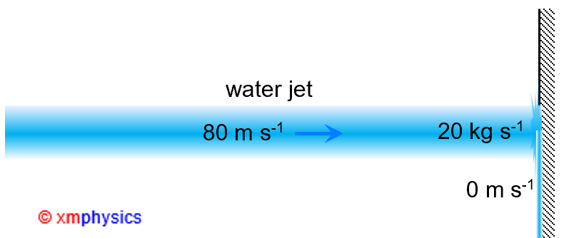 We note that in every second, 20 kg of 80 m s−1 water becomes 20 kg of 0 m s-1 water. This “destruction” of momentum requires a force. According to N2L, the rate of “destruction” of momentum is equal to the force