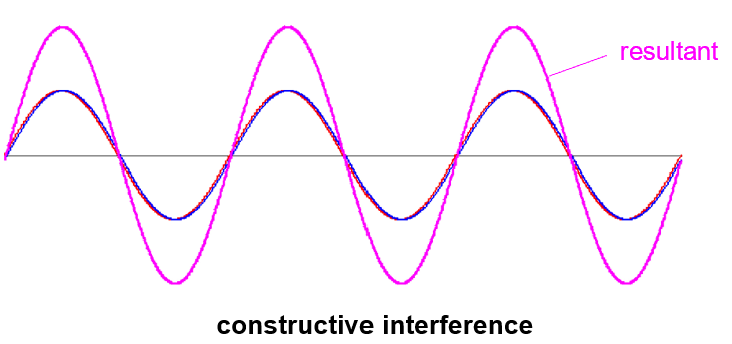 If the phase difference between the two sinusoidal waves is 0, 2π, 4π, 6π and so on, the two wave profiles will be exactly aligned to each other. The two waves are said to superpose in-phase. We are looking at a constructive interference and a resultant wave of amplitude 2A (shown in magenta).