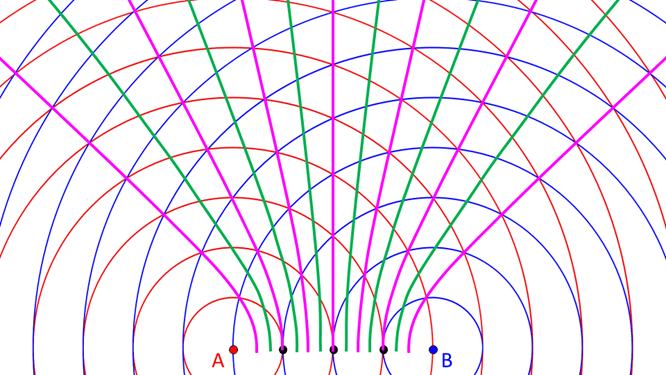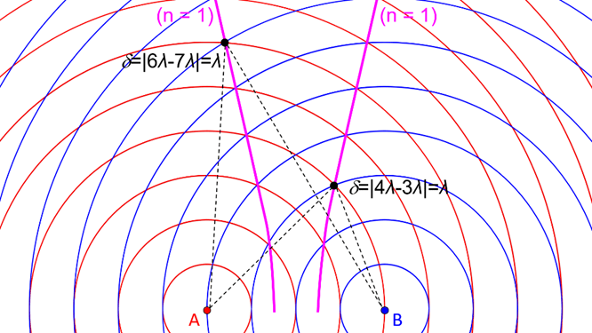 Let’s start by drawing concentric circles centred at two dippers A and B. These circles are meant to represent the wave crests (of the outward propagating waves). So the distance between two circular crests corresponds to one wavelength.
