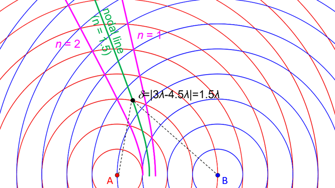 In between the nth order and (n+1)th order antinodal lines is the (n+1/2)th order nodal line, which joins up all the locations where the path difference is .