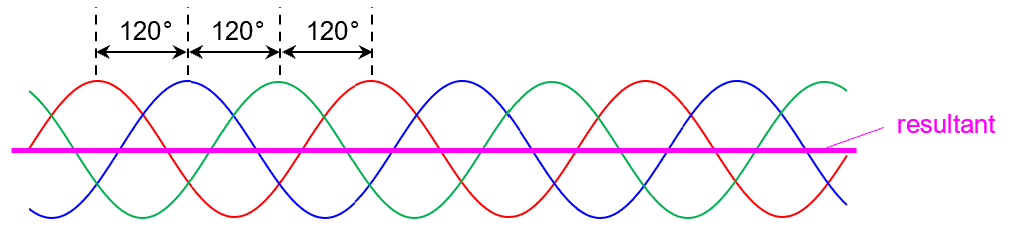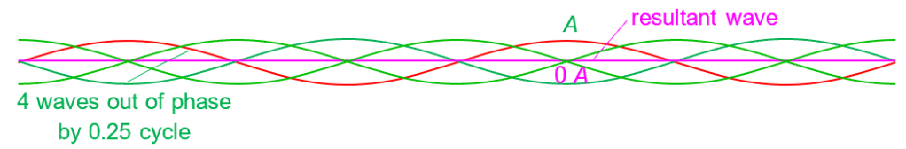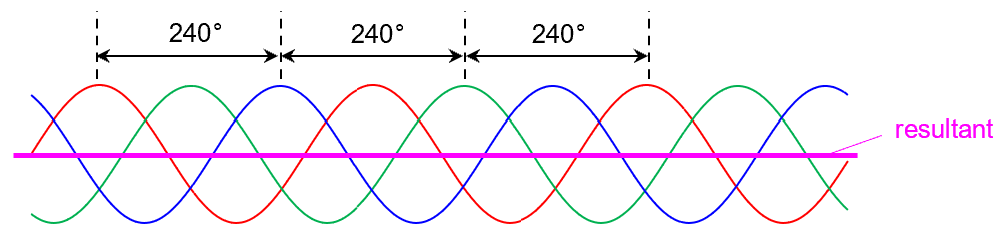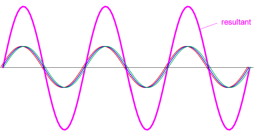 Ray C will arrive one-third of a cycle after ray B, which arrives one-third of a cycle after ray A. It is like we have 3 sinusoidal waves spaced apart with 120° between (A and B), (B and C) and (C and A). Do you realize that these 3 sinusoids are going to sum up to zero? The 3 rays interfere destructively to cancel one another out!