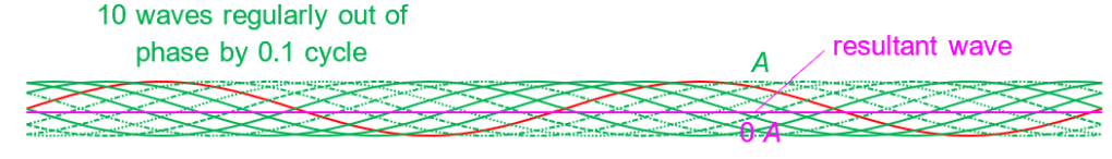 If we have 10 slits (and 10 rays), the first D.I. occurs when the 10 waves are spaced apart by . This happens when the path difference is
