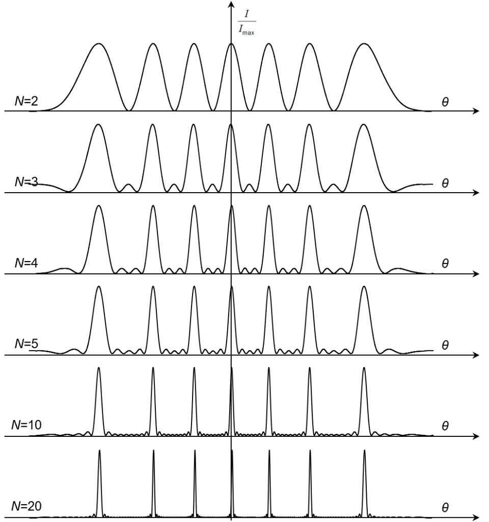 Note that as N increases the number of bright fringes do not change. Neither do their positions. However, they do become brighter, since they have amplitude NA and intensity (assuming each ray arrives on the screen with amplitude A and intensity I0). In the graphs above, the intensity has been “equalised” across the different N values because we have chosen to plot the normalized intensity
