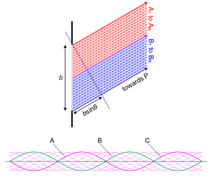 Surprisingly, there is a simple way to sort out this mess. In our minds, we can split the slit into two halves. The top half sends out rays A1 to AN while the second half send out rays B1 to BN. If A1 and B1 are in anti-phase with each other, so are A2 and B2, A3 and B3, and every pair of rays until AN and BN. Pairing up the rays this way makes it clear that all the rays will superpose to zero when A and B are in antiphase, which occurs when A and C are in-phase. So we conclude that a complete D.I. occurs when .