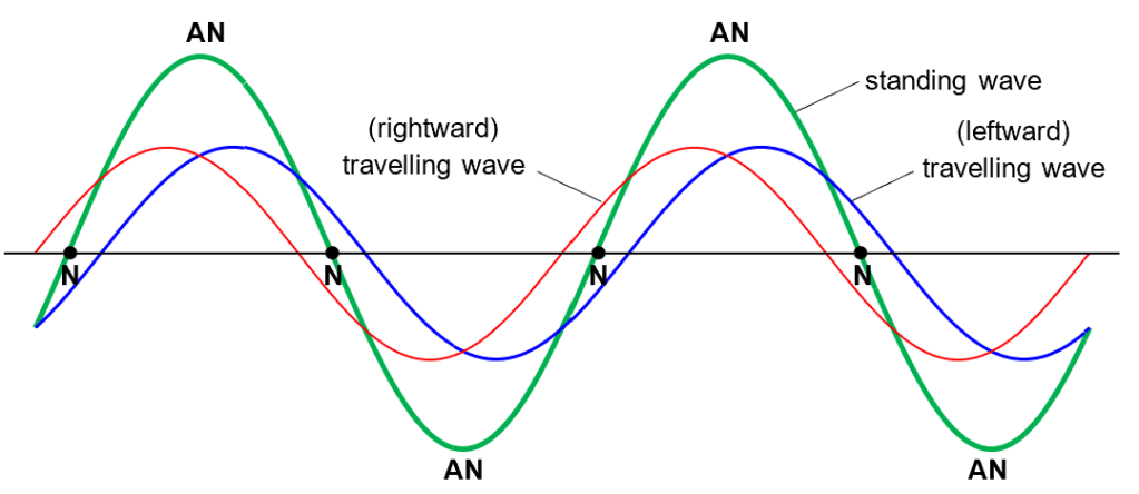 A standing wave has positions called antinodes (AN) where the amplitude (of oscillation) is maximum, and positions called nodes (N) where the amplitude is zero[1]. The segment between two adjacent nodes is called a loop. A loop corresponds to half a wavelength.