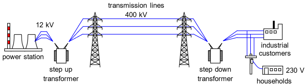 For this reason, the outputs of electric generators (at the power station) are first stepped up to extremely hight voltages (up to 500 kV) before they are put on the transmission lines. At the consumer end, the voltage has to be stepped back down to low voltages (rms 230 V for Singapore) for safety and insulation considerations. The device that accomplishes the necessary voltage conversion is called the transformer.
