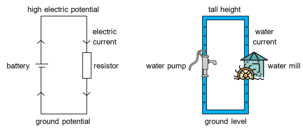 A crude but extremely useful analogy is that of a water pump (battery) that raises water (electric charges) to a tall height (high electric potential), whereupon the water (electric charges) is allowed to fall through a water mill (resistor) to return to ground level (ground potential). So the EMF is the potential difference the charges are raised by the battery, and PD is the potential difference the charges drops through the resistor. Since the charges are always returned to the ground potential after completing the circuit loop, the EMF of the battery is equal to the PD across the resistor. If there are more than one battery or resistor, then the total EMF of the circuit is always equal to the total PD of the circuit.