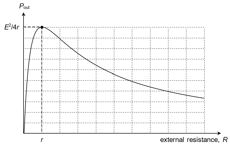 By differentiating the Pout equation with respect to R and solving for or otherwise, it can be shown that maximum Pout is achieved when the external resistance R matches the internal resistance r.