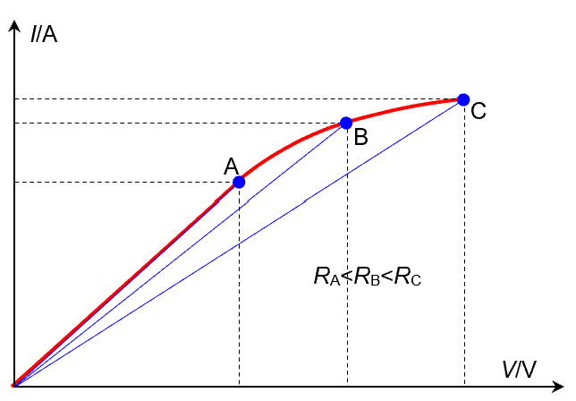 As a result, the I–V graph of a filament is a flattening curve at high V values. By the “wiper lines” leaning more and more towards the V-axis, we can tell that the resistance of the filament increases with V. This is because as the voltage across the filament increases, so does the current, and thus the power dissipation . Higher power dissipation results in a hotter filament, which has a higher resistance. This is why the I–V graph of a filament is straight only at low voltage and power. Once the voltage and power are high enough and the filament starts to heat itself up, the graph starts to flatten.