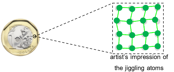 Nope. As a 7.62 g steel disc, the coin’s centre of mass is stationary. But the atoms[1] that make up the coin are each jiggling like crazy about their own equilibrium positions. The energy of the individual atoms that make up the coin is the coin’s thermal energy. The average amount of jiggling manifests as the temperature of the coin. To be precise, you will learn later that temperature is a measure of the average translational KE of the particles.