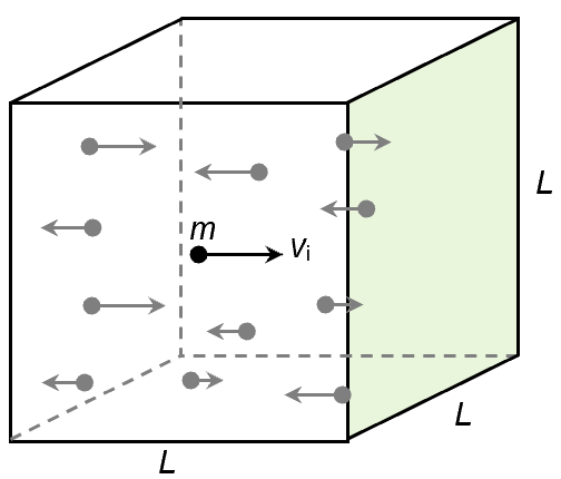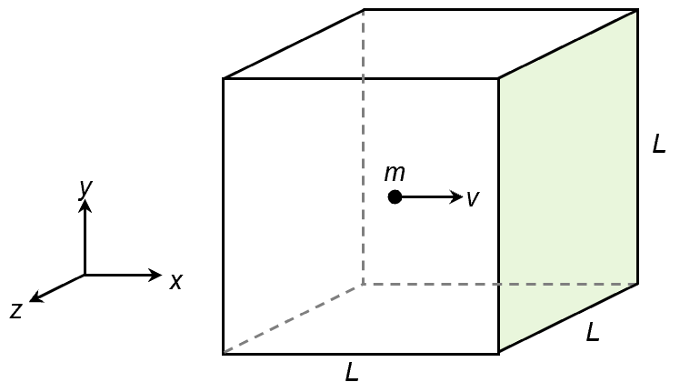 To start off, let’s imagine a space enclosed by a cube of sides L. To keep things simple, let’s imagine that there is only one solitary gas particle of mass m travelling at constant speed v in the x-direction in this cube.