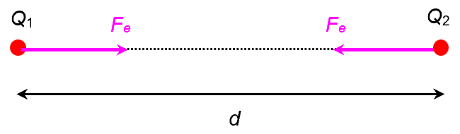 Coulomb’s Law states that the electrical force Fe between two stationary point charges Q1 and Q2 separated by distance d is given by the formula