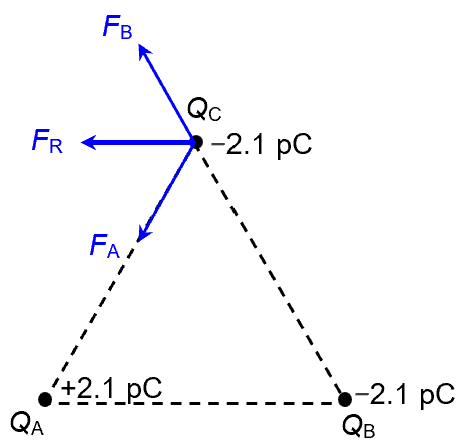 Note that QC is attracted towards QA, but repelled away from QB. FA and FB are thus in the directions shown in the diagram. The resultant electric force acting of QC is thus given by the vector summation of FA and FB. By inspection, the vector summation triangle is an equilateral triangle. So FR turns out to be a leftward force of 4.405 mN.