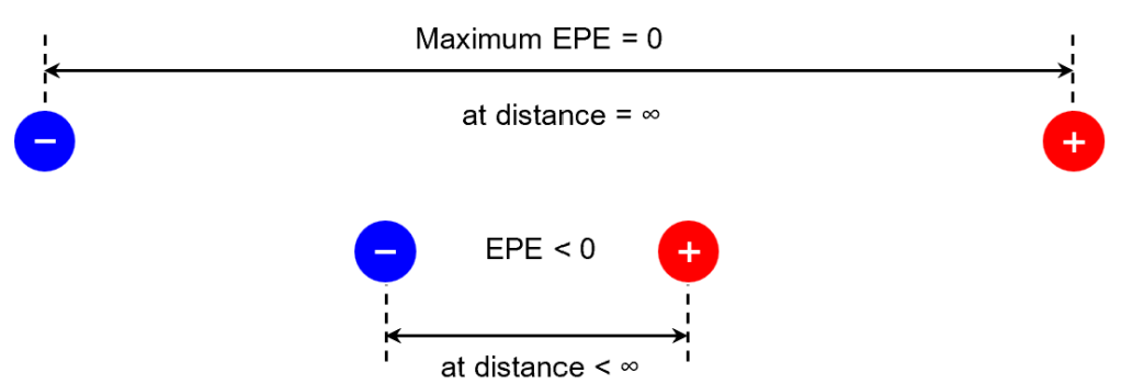Now imagine two unlike charges held at some distance apart. When they are released, the attractive electrical forces will make them accelerate towards each other. So as they move closer together, they are losing EPE in exchange for KE. Isn’t it obvious then that EPE is higher when they are further apart? The furthest they can be from each other is “infinite distance”, where EPE is chosen to be zero. So zero is the highest EPE for two unlike charges. Anything nearer than “infinite distance” is negative EPE. The closer the charges, the more negative the EPE.