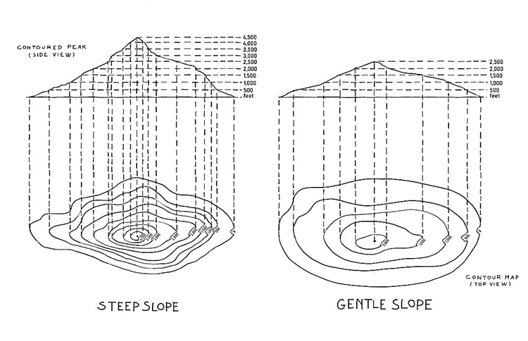 Besides field lines, we can also draw lines connecting points of the same V to represent an electric field. These lines are called the equipotential lines. For point charges, they are concentric circles which are spaced further and further apart (shown in green below). If you think that they look similar to contour lines on topography maps, you are spot on. As I said before, electric potential is kind of like “electric elevation”.
