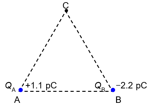 QA and QB are point charges of +1.1 pC and -2.2 pC bound at vertices A and B of an equilateral triangle of side 3.0 um as shown in the diagram below. Calculate