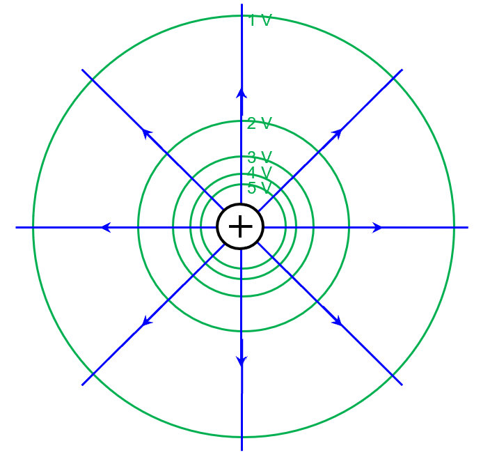 It is quite common to see equipotential lines overlaid on a field map. As the name suggests, an equipotential line is a line joining points with the same electric potential V. Any number of these lines can be drawn for any number of V. The important thing is to draw them at equal spacing of V (e.g. draw the equipotential lines for V=2.5 V, 3.0 V, 3.5 V… i.e. constant ΔV of 0.5 V). If we do this, equipotential lines can be quite expressive too: