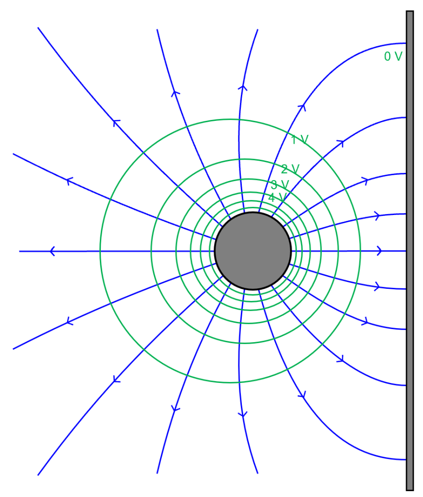 Above is the field map for a positively charged metal sphere and a metal plate. The sphere is held at 7 V while the plate is held at 0 V. Note that
