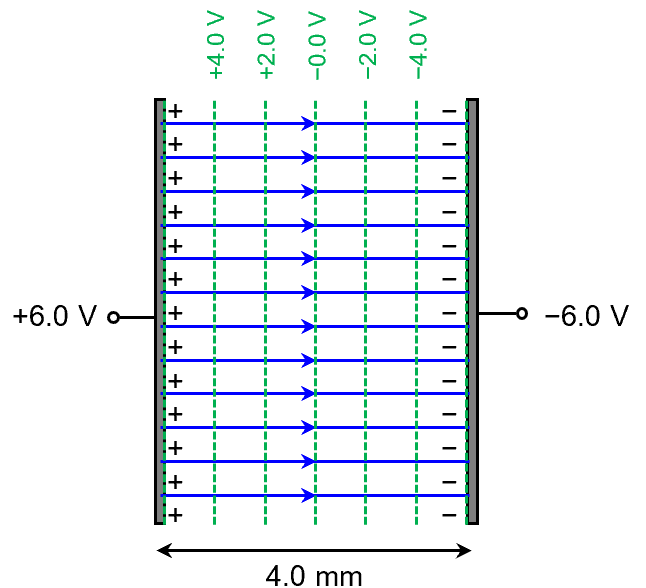 For example, the electric field between two plates held at +6.0 V and −6.0 V is assumed to be uniform. See how the field lines are drawn to be straight and equally spaced out? See how the equipotential lines are drawn perpendicular to the field lines and equally spaced out too? It is all very simple because the field is uniform. Since , the field strength between the parallel plates is simply the potential difference between the plates divided by the separation between them.