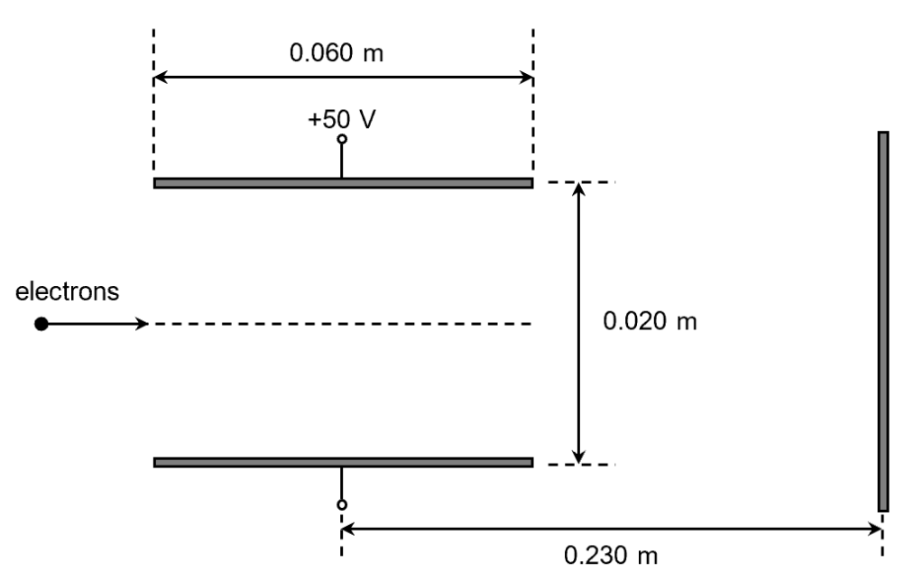 A beam of electrons, travelling at , passes through a uniform electric field between two plates of length 0.060 m and separation of 0.020 m, before striking the fluorescent screen placed 0.230 m from the centre of the plates. The top plate is at +50 V while the lower plate is at −50 V. Calculate the position where the electron beam strikes the fluorescent screen.