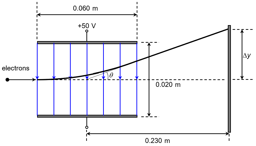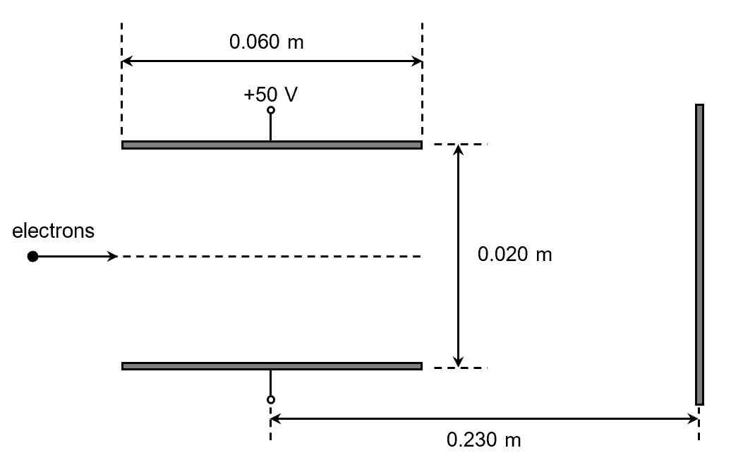 A beam of electrons, travelling at , passes through a uniform electric field between two plates of length 0.060 m and separation of 0.020 m, before striking the fluorescent screen placed 0.230 m from the centre of the plates. The top plate is at +50 V while the lower plate is at −50 V. Calculate the position where the electron beam strikes the fluorescent screen.