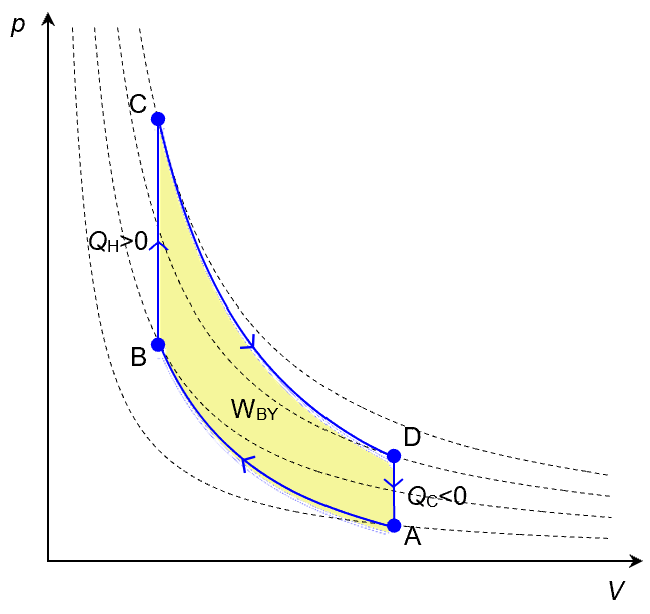 Note that the engine does positive work during the adiabatic expansion (power stroke) but negative work during the adiabatic compression (compression stroke). However, since the expansion occurred at higher pressure than the contraction, overall, it is the engine that is doing the net work. In fact, the area of the enclosed loop represents WBY, the net work done by the gasoline engine in one complete cycle.