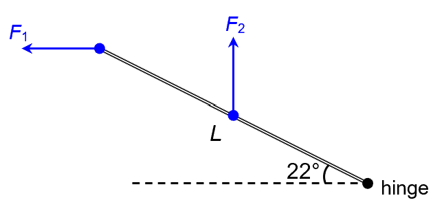 A hinged uniform rod of length L is held stationary at an angle of 22° by two forces: F1 and F2 applied at the end and midpoint of the rod respectively. Calculate the ratio of the magnitude of F1 to F2.