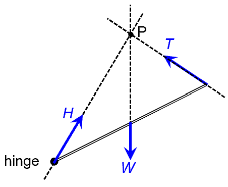 But both W and T produce zero moment about point P. So H must also produce zero moment about point P. The is possible only if H’s line of action also passes through P. We are thus able to deduce that H is directed towards P as well.