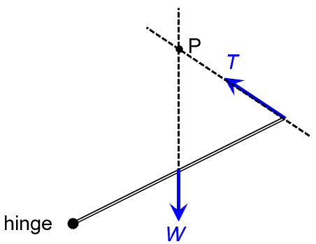 But both W and T produce zero moment about point P. So H must also produce zero moment about point P. The is possible only if H’s line of action also passes through P. We are thus able to deduce that H is directed towards P as well.