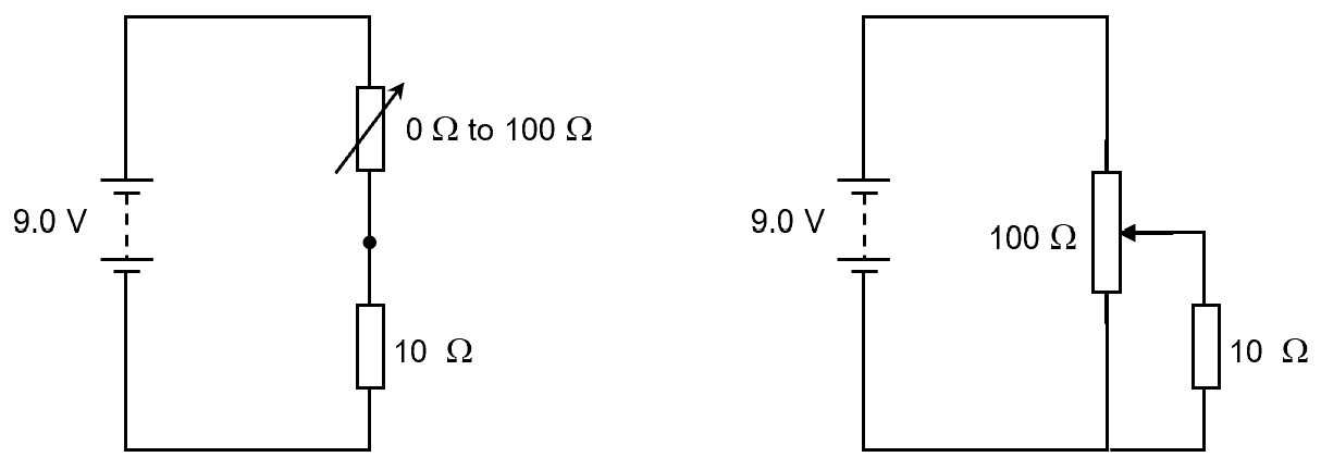 For both circuits, determine the range of voltage across the fixed 10 W resistor.