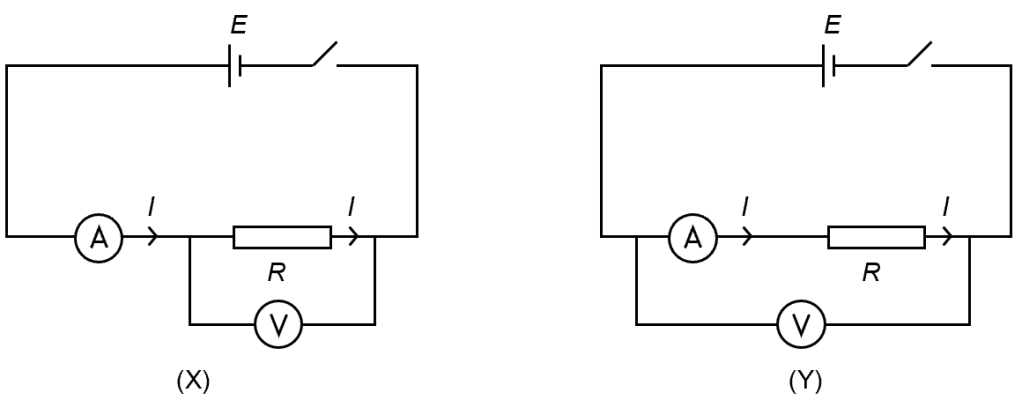 Above are two circuits for determining the unknown resistance R. An ideal ammeter has zero resistance. An ideal voltmeter has infinite resistance. For most resistance R, both circuits are equally good. However, if resistance of R is so small that it is comparable to the ammeter’s resistance, then only one circuit is good. Conversely, if R is so large that it is comparable to the voltmeter’s resistance, then the other circuit is good. Which is which?