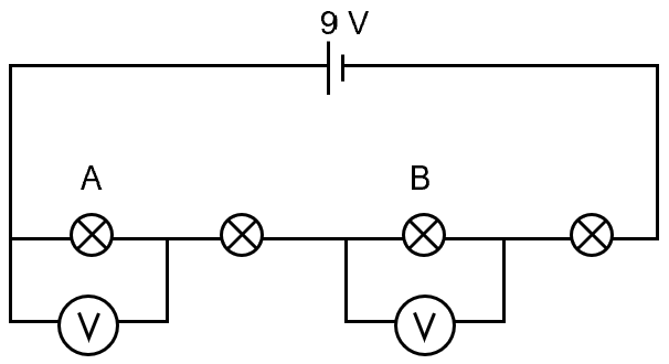 - 0 V across A, 9 V across B