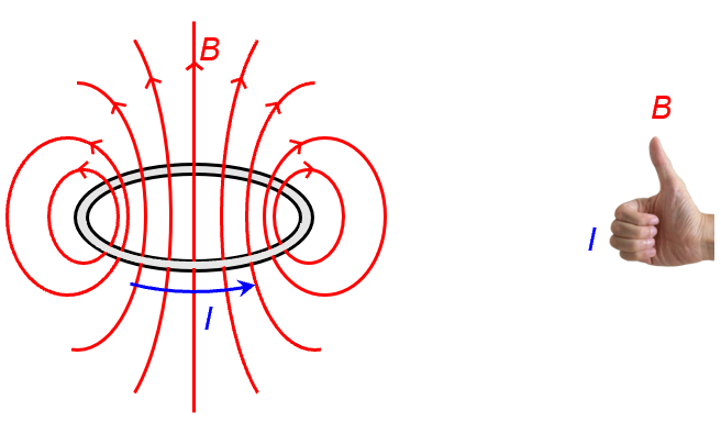 To use the right hand grip rule (RHGR), point your thumb in the direction of the (conventional) current I and curl your fingers. The direction of your curled fingers will mirror the circumferential direction of the magnetic field B.