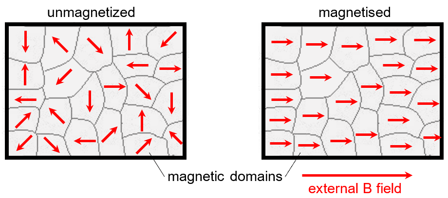So how does iron (and permanent magnets) produce a magnetic field? It turns out that each iron atom is a tiny magnet (something to do with this thing called electron spin). And a region where atoms are magnetized in the same direction is called a magnetic domain. An unmagnetized piece of iron is basically segmented into a large number of individual magnetic domains which are randomly oriented, so the resultant field is negligible. In the presence of an external magnetic field (such as that of the solenoid), these magnetic domains will align themselves in the direction of the external magnetic field. When aligned in the same direction, the resultant magnetic field of all these magnetic domains is substantial.