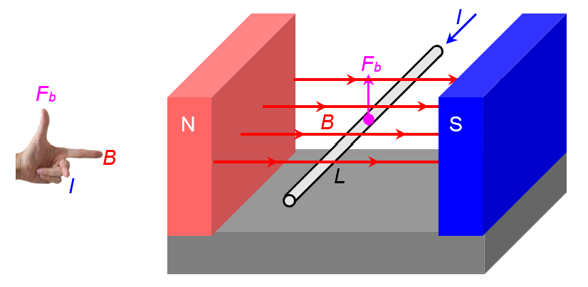 There is something very interesting about the direction of Fb. It is NOT in the direction of B. It is also NOT in the direction of I. Instead, it is in a third direction – the direction that is perpendicular to both B and I. To use the Fleming’s Left Hand Rule (FLHR), do the hand pistol (and shout “FBI”!), because your thumb, index finger and middle finger are pointing at Fb, B and I respectively.
