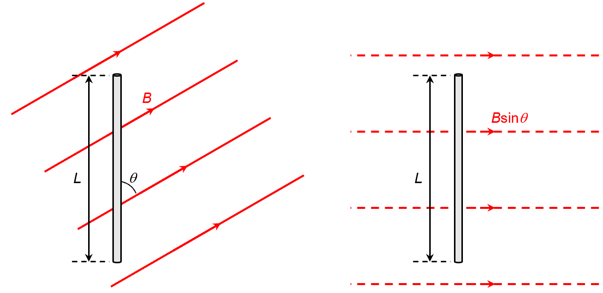 Now, what if B and I are not perpendicular to each other? Well, if the magnetic field is parallel to the current, then zero magnetic force is exerted on the wire. This tells us that only the component of B perpendicular to the current, , exerts a force on the wire. So if B and I are misaligned by angle q, then