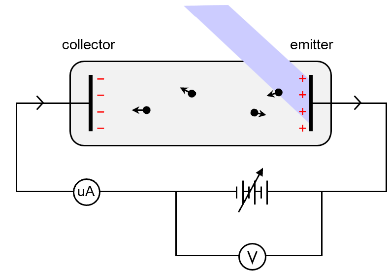 If the collector is connected to the negative terminal of the variable power supply, it is said to be in negative bias. Electrically, the collector (being negatively charged) is now repulsive to the (negatively charged) photoelectrons. From the energy perspective, a negative bias establishes a potential energy barrier for the photoelelectrons.