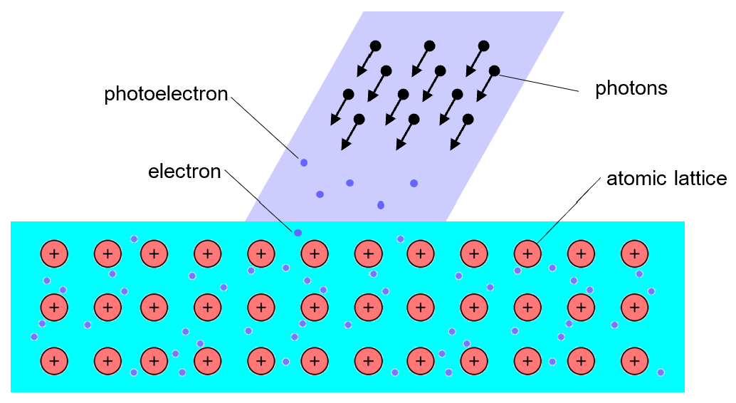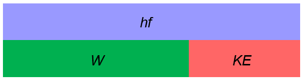 If an electron is lucky enough to be “hit” by a photon, it can absorb the energy of the photon (hf). After using part of the energy to break free from the metal lattice (W), it escapes with the balance of the energy as its kinetic energy (KE). This energy transfer can be represented by the equation
