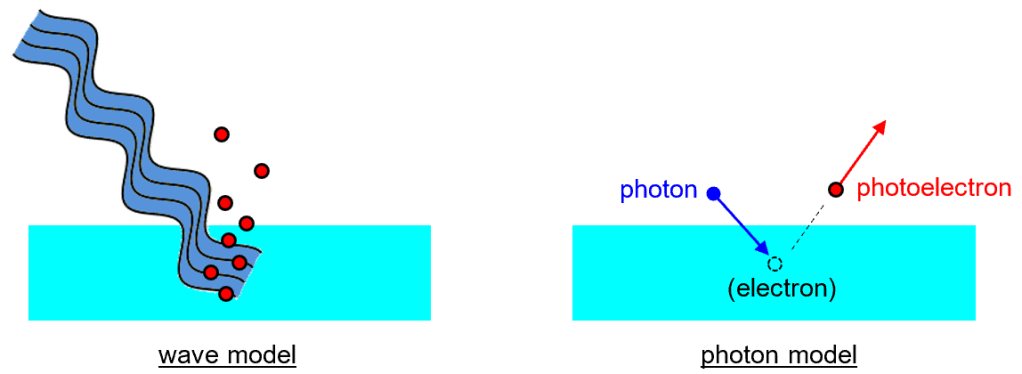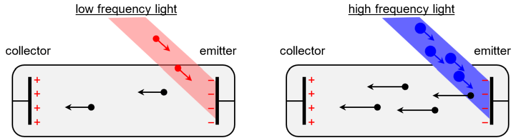 Firstly, can the photon theory explain why higher intensity results in higher rate of emission? The picture in our head is that of photons raining down at the metal. Of all the photons arriving at the metal, only a tiny fraction of the photons are absorbed by electrons[1]. Nevertheless, higher intensity means more photons arriving at the metal per unit time, which means more electrons being “hit” by photons per unit time, which means more photoelectrons liberated per unit time. Yay!