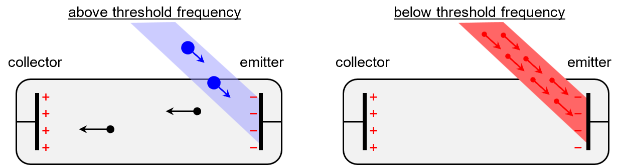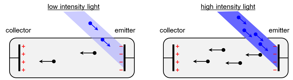 Firstly, can the photon theory explain why higher intensity results in higher rate of emission? The picture in our head is that of photons raining down at the metal. Of all the photons arriving at the metal, only a tiny fraction of the photons are absorbed by electrons[1]. Nevertheless, higher intensity means more photons arriving at the metal per unit time, which means more electrons being “hit” by photons per unit time, which means more photoelectrons liberated per unit time. Yay!