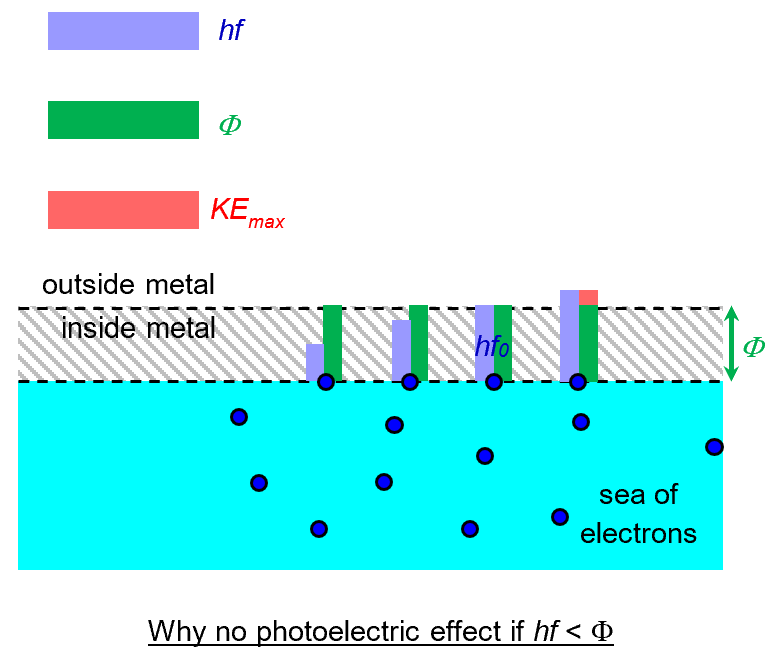 Now the alert students will ask, if one photon does not have sufficient energy, why can’t the electron accumulate the energy of a few photons? Well, it turns out that the electron is unable to hold on to any surplus energy for long: if it does not escape after absorbing the energy of one photon, it gives up the energy immediately and start from square one again. Besides, the chance of an electron being hit by two photons simultaneously at the same time is practically zero (except at extremely high intensity situations). Hence, one punch one kill is the rule of the game.