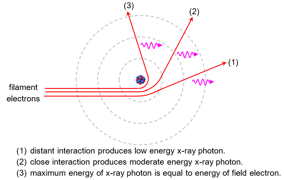 In the x-ray tube, some of the filament electrons can get really close to the tungsten nuclei[1]. The nucleus of a tungsten atom is a +74e of (positive) charge squeezed into a tiny volume. It is almost like the proverbial point charge whose field strength approaches infinity at close distance. As a result, these filament electrons are deflected sharply as they are “sucked” towards the nucleus. The acceleration they undergo is so strong that x-ray photons are emitted in the process.